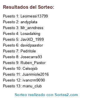 Lista de participantes: Leomessi13799, davidpaastor, ivancrm9090, JaviXD_1999, Juanmiole2016, Losadaking, Pedritole, Ruben_Pastor, manu_club, Mr_anndress, Celsojsb, andyplata, Josecarra93.