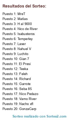 Lista de participantes: Vamo River, Luchito, Matías, Seba 85, Nahuel V, Teeka, MreT, Gian 7, GonzaCarp, Feleh, Nacho xfl, Richard, Nico de River, Nico Pedazo, Garrote, El Presi, Laser, H al 9000, Temperley, Isabusteros.