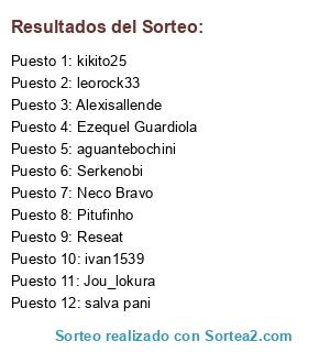Lista de participantes: kikito25, Neco Bravo, Jou_lokura, Ezequel Guardiola, Alexisallende, ivan1539, aguantebochini, Serkenobi, Pitufinho, Reseat, salva pani, leorock33.