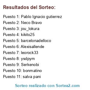 Lista de participantes: ysdpym, salva pani, barcelonadelloco, Alexisallende, jou_lokura, Serkenobi, leorock33, Neco Bravo, Pablo Ignacio gutierrez, bonmatino, kikito25.