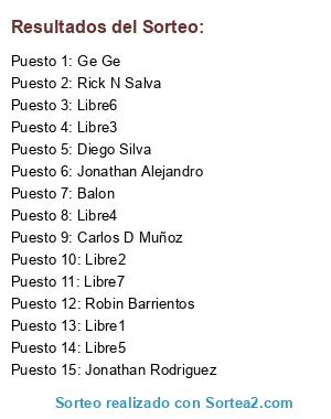 Lista de participantes: Jonathan Alejandro, Jonathan Rodriguez, Balon, Rick N Salva, Diego Silva, Carlos D Muñoz, Ge Ge, Robin Barrientos, Libre1, Libre2, Libre3, Libre4, Libre5, Libre6, Libre7.