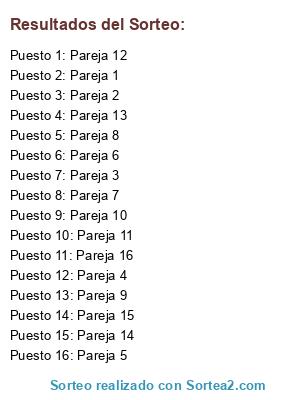 Lista de participantes: Pareja 1, Pareja 2, Pareja 3, Pareja 4, Pareja 5, Pareja 6, Pareja 7, Pareja 8, Pareja 9, Pareja 10, Pareja 11, Pareja 12, Pareja 13, Pareja 14, Pareja 15, Pareja 16.