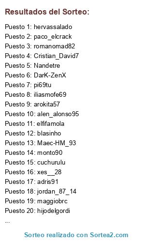 Lista de participantes: alen_alonso95, xes__28, arokita57, memetchite7, hervassalado, Nandetre, fran_1994, romanomad82, adris91, ReloK, markinhu6, bombermonster, cuchurulu, jlamp76, jnl94, maike_irene, blasinho, Maec-HM_93, DarK-ZenX, elcorso, Cristian_David7, paco_elcrack, pi69tu , hijodelgordi , iliasmofe69 , maggiobrc , kevindinho , ovicop , JaviHrT , elfifamola, monto90 , jordan_87_14.