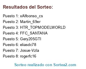 Lista de participantes: Martin_69er, Josue-Vzla, xAlfoonso_cs, eliasdc78, FFC_SANTANA, HTR_TOPMODELWORLD, rogerfc16, Gery205GTI.