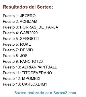 Lista de participantes: GABI2020, PORRAS_DE_PARLA, CARLOXDIM1, DEIVID, ACHIZAM, PANCHOT23, TITODEVERANO, ROKE, SERGIO11, JOS, ADRIANPAINTBALL, JECERO, MPOMBIX.