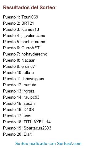 Lista de participantes: TITI_AXEL_14, erdin87, BRT21, jf_valenciano, CurroAFT, sesan, raulpc93, D10S, nohayderecho, matute, noel_moreno, bmwniggas, Nacaan, aser, Spartacus2393, rgrprz, Txuni069, lcamus13, Elaiti, eltato.