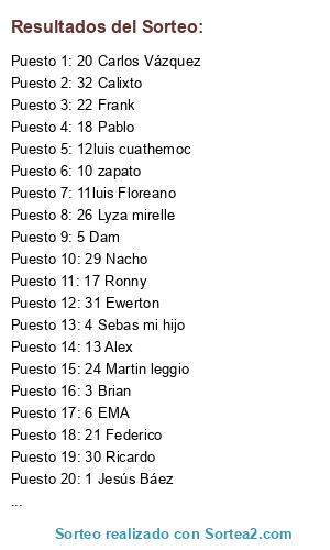 Lista de participantes: 1 Jesús Báez, 2 Nico, 3 Brian, 4 Sebas mi hijo, 5 Dam, 6 EMA, 7 presidente, 8 Gabriel, 9 Joaquín, 10 zapato, 11luis Floreano, 12luis cuathemoc, 13 Alex, 14Alexander, 15 Joaquín España, 16 Mario Andrés, 17 Ronny, 18 Pablo, 19 Andrés Padilla, 20 Carlos Vázquez, 21 Federico, 22 Frank, 23 Kevin, 24 Martin leggio, 25 Mariano, 26 Lyza mirelle, 27 Juan Carlos, 28 Raúl, 29 Nacho, 30 Ricardo, 31 Ewerton, 32 Calixto.