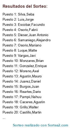 Lista de participantes: Aguirre,Alejandro, Agustin,Mauro, Burgos,Juan, Caceres,Agustin, Castillo,Martin, Dieser,Juan Antonio, Escobar,Facundo, Gonzalez,Enrique, Grillo,Walter, Juarez,Daniel, Luis,Jorge, Luque,Matte, Monzares,Brian, Moreno,Axel, Osorio,Fabrii, Osorio,Mariano, Pampii,Nahuu, Reartes,Dario, Saboldelli,Juancho, Samaniego,Alejandro, Samudio,Kevin, Silva,Seba, Vargas,Javi, Viollaz,Nacho.