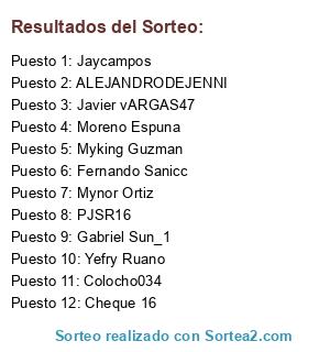 Lista de participantes: Javier vARGAS47, Colocho034, Moreno Espuna, Fernando Sanicc, Yefry Ruano, Jaycampos, PJSR16, Gabriel Sun_1, Myking Guzman, Mynor Ortiz, Cheque 16, ALEJANDRODEJENNI.