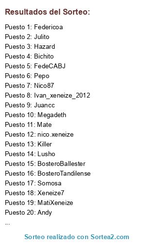 Lista de participantes: Nico87, FedeCABJ, Federicoa, Hxeneize97, Lusho, Bichito, Ivan_xeneize_2012, Megadeth, BosteroTandilense, nico.xeneize, Hazard, Mate, Somosa, Pepo, Julito, BosteroBallester, Killer, Andy, MatiXeneize, Juancc, Xeneize7.