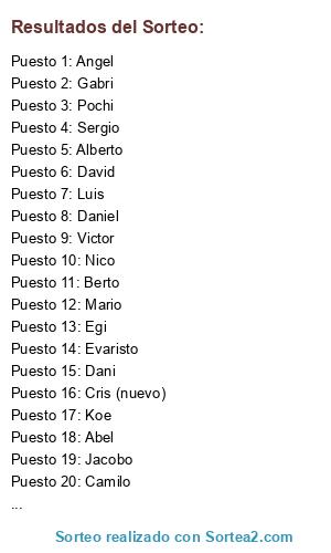 Lista de participantes: Abel, Berto, Dani, David, Fer, A.Salado, Jacobo, Angel, Camilo, Egi, Josue, Koe, Nico, Pochi, Gabri, Mario, Victor, Sergio, Evaristo, Alberto, Joni, Cris (nuevo), Daniel, Luis.