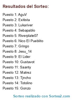 Lista de participantes: AguV, Gonzo, Gringo, El Lider, Exitista, Gustavot, Jesu_14, Lukariver, Matrez, Nico El Pueblito, Riverplate07, Saanty, Sebapablo, Tjncho, Totolino.