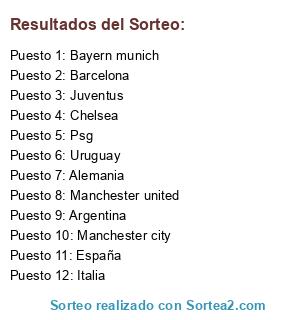Lista de participantes: Bayern munich, Chelsea, Manchester city, Barcelona, Alemania, Manchester united, Juventus, Italia, Argentina, Uruguay, España, Psg.