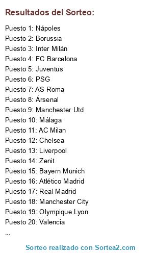 Lista de participantes: Real Madrid, FC Barcelona, Manchester Utd, Manchester City, Chelsea, Inter Milán, AC Milan, Bayern Munich, PSG, Ársenal, Liverpool, Atlético Madrid, Tottenham, Zenit, Olympique Lyon, Juventus, Valencia, AS Roma, Borussia, Nápoles, Málaga, Newcastle.
