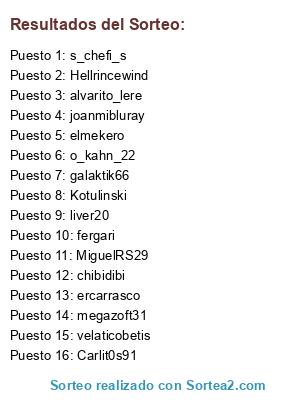 Lista de participantes: elmekero, Hellrincewind, alvarito_lere, galaktik66, fergari, liver20, ercarrasco, Kotulinski, velaticobetis, megazoft31, MiguelRS29, s_chefi_s, joanmibluray, o_kahn_22, chibidibi, Carlit0s91.