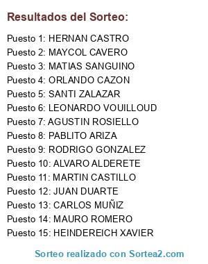 Lista de participantes: HEINDEREICH XAVIER, ALVARO ALDERETE, LEONARDO VOUILLOUD, MAYCOL CAVERO, CARLOS MUÑIZ, PABLITO ARIZA, MAURO ROMERO, MARTIN CASTILLO, ORLANDO CAZON, SANTI ZALAZAR, MATIAS SANGUINO, RODRIGO GONZALEZ, HERNAN CASTRO, AGUSTIN ROSIELLO, JUAN DUARTE.