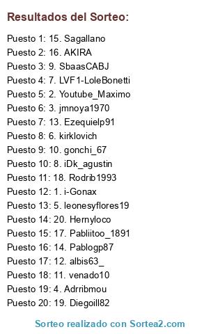 Lista de participantes: 1. i-Gonax, 2. Youtube_Maximo, 3. jmnoya1970, 4. Adrribmou, 5. leonesyflores19, 6. kirklovich, 7. LVF1-LoleBonetti, 8. iDk_agustin, 9. SbaasCABJ, 10. gonchi_67, 11. venado10, 12. albis63_, 13. Ezequielp91, 14. Pablogp87, 15. Sagallano, 16. AKIRA, 17. Pabliitoo_1891, 18. Rodrib1993, 19. Diegoill82, 20. Hernyloco.