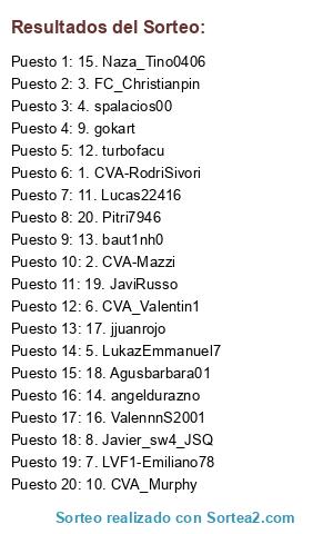 Lista de participantes: 1. CVA-RodriSivori, 2. CVA-Mazzi, 3. FC_Christianpin, 4. spalacios00, 5. LukazEmmanuel7, 6. CVA_Valentin1, 7. LVF1-Emiliano78, 8. Javier_sw4_JSQ, 9. gokart, 10. CVA_Murphy, 11. Lucas22416, 12. turbofacu, 13. baut1nh0, 14. angeldurazno, 15. Naza_Tino0406, 16. ValennnS2001, 17. jjuanrojo, 18. Agusbarbara01, 19. JaviRusso, 20. Pitri7946.