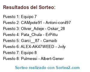 Lista de participantes: ALEX-AK47WEED - Jvily, Oliver_Adeje - Oskar_28, Garci__87 - Carnaib, CAMpote91 - Antoni-conil97, Pata_Chula - ErPittu, Pulmessi - Albert-Gener, Equipo 7, Equipo 8.
