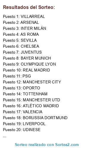 Lista de participantes: BARCELONA, UDINESE, MANCHESTER CITY, ARSENAL, BORUSSIA DORTMUND, NÁPOLES, MANCHESTER UTD, REAL MADRID, ATLÉTICO MADRID, CHELSEA, VALENCIA, TOTTENHAM, FIORENTINA, LIVERPOOL, BAYER MUNICH, AC MILÁN, PSG, INTER MILÁN, JUVENTUS, OLYMPIQUE LYON, SEVILLA, AS ROMA, OPORTO, VILLARREAL.