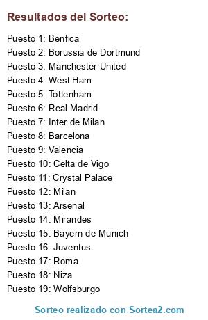 Lista de participantes: Manchester United, Newcastle, Oviedo, Real Madrid, Liverpool, Galatasaray, Inter de Milan, Mirandes, Kaiserlautern, Napoles, Crystal Palace, Tottenham, Leicester, Benfica, Celta de Vigo, Wolfsburgo, Lazio, Milan, Fiorentina, Niza, Sevilla, Chelsea, Zenit, Arsenal, Las Palmas, Everton, Bayern de Munich, Manchester City, PSG, Barcelona, Valencia, Borussia de Dortmund, Villarreal, Schalke04, Olympique de Lyon, Juventus, Atletico de Madrid, Sporting de Lisboa, Athletic de Bilbao, Bayer Leverkusen, Oporto, Stoke City, West Ham, Roma, Norwich.