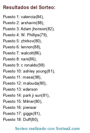 Lista de participantes: walcott(86),, arshavin(88),, ashley young(81),, zhirkov(80),, malouda(80),, Duff(80),, Milner(80),, W. Phillips(79),, Adam jhonson(82),, giggs(81),, nani(86),, valencia(84),, park ji sun(81),, lennon(88),, messi(98),, c ronaldo(98), pienaar, ederson.