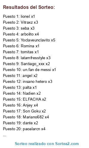 Lista de participantes: edits de los picus x4, dante x2, pelicanger x2, arbolito x4, ELFACHA x2, Son Goku x2, insano hetero x3, fabriciozzzz x2, isair7989pan x2, znasif x4, angel x2, chantysprocarmona x4, Laratadetucuarto x2, elañainsano x1, beowulf x1, paoalarcn x4, Alexx x2, messi x1, Anjey x4, Zanic x1, Jack x169DA HOOD x3, Marcelazabaleta x1, FGanadores x1, gust x1, Mist x1, Yoclaveunclavito x5, palta x1, ByJoseYT x1, Vitraxz x3, lionel x1, elwaza x1, leoreynoso0 x1, un.fan de messi x1, Santiago_xxx x2, Naviden x5, Anthony x1, El messi pro x1, Leo x23Santos x1, Romina x1, latamfresstyle x3, Eithan x3, Maximo pou x4, lautaro.g x1, seba x3, tomitas x1, Mariano682 x4, Franciscoascua35 x1, … x1, Nadien x2, Agustinas Casa x1, benjapuita x1, alitre x4, jakecob x5, regalos x1.