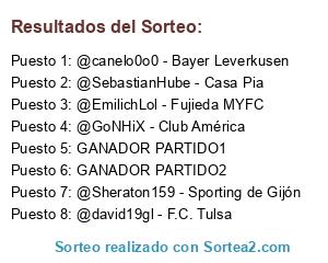 Lista de participantes: @GoNHiX - Club América, @EmilichLol - Fujieda MYFC, @canelo0o0 - Bayer Leverkusen, @david19gl - F.C. Tulsa, @Sheraton159 - Sporting de Gijón, @SebastianHube - Casa Pia, GANADOR PARTIDO1, GANADOR PARTIDO2.