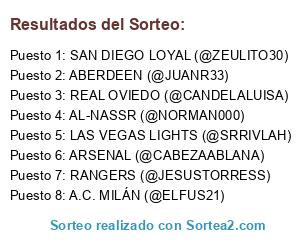Lista de participantes: REAL OVIEDO (@CANDELALUISA), ARSENAL (@CABEZAABLANA), RANGERS (@JESUSTORRESS), LAS VEGAS LIGHTS (@SRRIVLAH), A.C. MILÁN (@ELFUS21), SAN DIEGO LOYAL (@ZEULITO30), AL-NASSR (@NORMAN000), ABERDEEN (@JUANR33).
