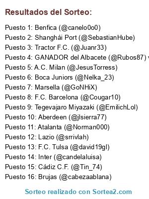 Lista de participantes: Atalanta (@Norman000), Lazio (@srrivlah), Marsella (@GoNHiX), A.C. Milan (@JesusTorress), Brujas (@cabezaablana), Boca Juniors (@Nelka_23), Tractor F.C. (@Juanr33), Tegevajaro Miyazaki (@EmilichLol), Inter (@candelaluisa), GANADOR del Albacete (@Rubos87) vs Athletic Club (@Txemabutrera), Benfica (@canelo0o0), F.C. Tulsa (@david19gl), Shanghái Port (@SebastianHube), Cádiz C.F. (@Tin_74), Aberdeen (@jlsierra77), F.C. Barcelona (@Cougar10).