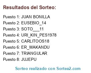 Lista de participantes: ER_WAKANDU, JUAN BONILLA, JUJEPU, CARLITOOS18, EUSEBIO_14, SOTO___11, URI_KIN_PES1978, TRIANGULAR.