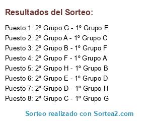 Lista de participantes: 2º Grupo H - 1º Grupo B, 2º Grupo G - 1º Grupo E, 2º Grupo B - 1º Grupo F, 2º Grupo E - 1º Grupo D, 2º Grupo C - 1º Grupo G, 2º Grupo D - 1º Grupo H, 2º Grupo F - 1º Grupo A, 2º Grupo A - 1º Grupo C.