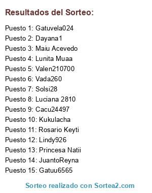 Lista de participantes: Gatuvela024, Rosario Keyti, Luciana 2810, Solsi28, Kukulacha, JuantoReyna, Lindy926, Princesa Natii, Gatuu6565, Dayana1, Valen210700, Maiu Acevedo, Cacu24497, Vada260, Lunita Muaa.