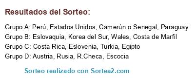 Lista de participantes: Turkia, Eslovenia, Korea del Sur, Wales, Austria, Egipto, Camerún o Senegal, R.Checa, Escocia, Paraguay, Costa Rica, Eslovaquia, Rusia, Costa de Marfil, Perú, Estados Unidos.