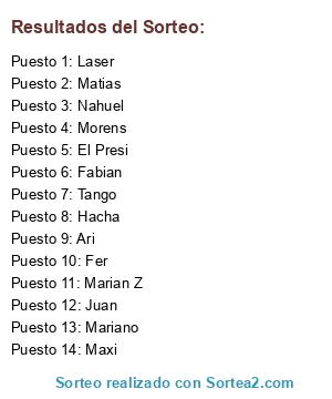 Lista de participantes: Tango, Marian Z, Morens, Maxi, Fer, Juan, Laser, Ari, Nahuel, Matias, El Presi, Hacha, Fabian, Mariano.