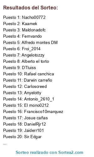 Lista de participantes: Robfer15, Anthony da mata, Darwin carreño, FC Angel Duran, Rafael canchica, Ronny 1705, Francisco10marquez, Nelson6111, Froi_2014, Maldonadofc, Elpelonvzla, Josue cañas, Jaiderr101, El pitre, Carloscreed, Alberto el torto, El mono0212, D10s2000, Euro Nava, Antonio_2610_1, DTluiss, Kaamek, Brayaanjpaa, Jaciel mata1, Alfredo montes DM, Anyelotty, DanielRjr12, Jone Gg, Nacho00772, Sir.Edgar, Fernvando, Angelotozzy.
