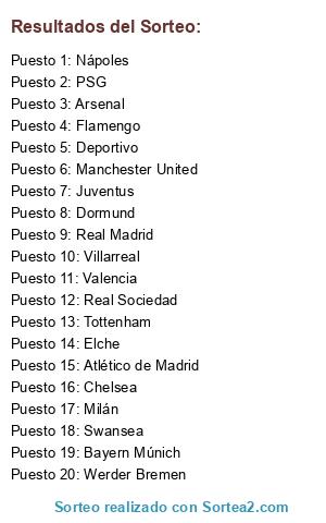 Lista de participantes: Tottenham, Flamengo, Atlético de Madrid, Werder Bremen, PSG, Swansea, Manchester United, Elche, Nápoles, Chelsea, Bayern Múnich, Arsenal, Valencia, Real Madrid, Juventus, Villarreal, Dormund, Deportivo, Milán, Real Sociedad.