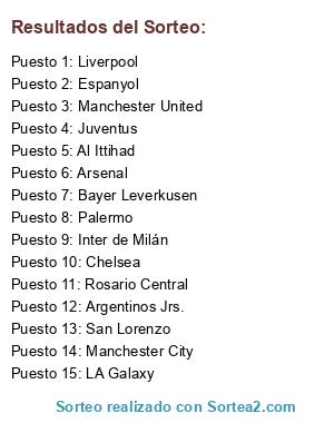 Lista de participantes: San Lorenzo, Arsenal, Al Ittihad, Chelsea, Rosario Central, Juventus, Argentinos Jrs., Bayer Leverkusen, Inter de Milán, LA Galaxy, Espanyol, Palermo, Manchester United, Manchester City, Liverpool.