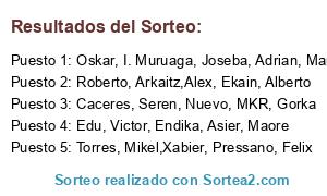 Lista de participantes: Edu, Victor, Endika, Asier, Maore, Roberto, Arkaitz,Alex, Ekain, Alberto, Torres, Mikel,Xabier, Pressano, Felix, Oskar, I. Muruaga, Joseba, Adrian, Manu, Caceres, Seren, Nuevo, MKR, Gorka.