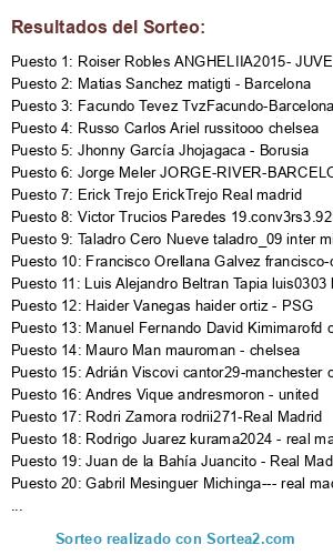 Lista de participantes: Boris AcUña Pereira Boris_azul25 manchester city, Taladro Cero Nueve taladro_09 inter milan, Chente Rod WE_Master Chelsea, Andres Vique andresmoron - united, Rodri Zamora rodrii271-Real Madrid, Mauro Man mauroman - chelsea, Rodolfo Roggero fitofarais - Real madrid, Edu Gonzalez educarp4 real madrid, Rodrigo Juarez kurama2024 - real madrid, Marcelo Rodríguez Marcelocap - PSG, Manuel Fernando David Kimimarofd chelsea, Russo Carlos Ariel russitooo chelsea, Jorge Meler JORGE-RIVER-BARCELONA, Uver Chavez HUMILLADOR - BORUSSIA DORMUT, Jhonny García Jhojagaca - Borusia, Roiser Robles ANGHELIIA2015- JUVE, Francisco Orellana Galvez francisco-cabj-----real madrid, Matias Sanchez matigti - Barcelona, Precaución James Howlett Gonzalez-Latapiatt Aguilar Kist- arsenal de inglaterra, Erick Trejo ErickTrejo Real madrid, Victor Trucios Paredes 19.conv3rs3.92 - AC Milan, Lucas Gonzalez Educarp14, Facundo Tevez TvzFacundo-Barcelona, Adrián Viscovi cantor29-manchester city, Juan de la Bahía Juancito - Real Madrid, Luis Alejandro Beltran Tapia luis0303 barza, Haider Vanegas haider ortiz - PSG, Gabril Mesinguer Michinga--- real madrid.