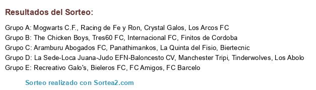 Lista de participantes: Crystal Galos, Los Abolo, Recreativo Galo's, Tres60 FC, Aramburu Abogados FC, La Sede-Loca Juana-Judo EFN-Baloncesto CV, Panathimankos, La Quinta del Fisio, The Chicken Boys, Tinderwolves, Los Arcos FC, Racing de Fe y Ron, FC Barcelo, Manchester Tripi, Finitos de Cordoba, FC Amigos, Mogwarts C.F., Internacional FC, Biertecnic, Bieleros FC.