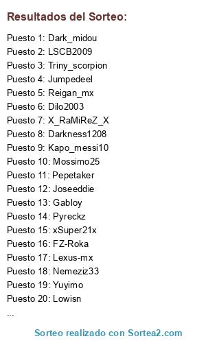 Lista de participantes: Nemeziz33, Gabloy, FZ-Latin, Woodycheco, Manuelstrike95, X_RaMiReZ_X, Mossimo25, Platahh, Carlosguz, Snake012, Dilo2003, Pyreckz, Lowisn, Joseeddie, Kapo_messi10, LSCB2009, Epildemo, Kevplunk86, Dark_midou, Darkness1208, Jumpedeel, A544garcia, Cuatroloco21, Triny_scorpion, Devil-cr9, Yuyimo, Maldini0301, Reigan_mx, Pepetaker, xSuper21x, FZ-Roka, Lexus-mx.