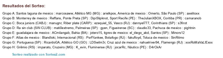 Lista de participantes: Atlético GO (GO) : LDSwilm3r, Atlético MG (MG) : arielkpos, Bahia (BA) : jotero15, Botafogo (RJ) : fakufloyd, Corinthians (SP) : s3firot, Coritiba (PR) : camaranob, Cruzeiro (MG) : K_evin, Figueirense (SC) : claudio33, Flamengo (RJ) : xxxRoMaVaLlExxx, Fluminense (RJ) : jocarRc, Grêmio (RS) : imparato, Internacional (RS) : PsrfYankee, Náutico (PE) : D4rCkAr, Palmeiras (SP) : gyen, Ponte Preta (SP) : DipiSlipknot, Portuguesa (SP) : RicardoGA, Santos (SP) : Minors12, São Paulo (SP) : axelitoxx, Sport Recife (PE) : TheJulianXBOX, Vasco (RJ) : dannyel777, Boca juniors (CABJ) : manugnr, Riber plate (CARP) : ezequiel_55, Ra sin club (SIN CLUB) : mati0extremo, America de mexico : Omerto, Monterrey de mexico : Reffans, Toluca de mexico : SinRitmo, guadalajara de mexico : ACmilangab, Pachuca de mexico : pightnin, Santos laguna de mexico : marcosaww, Cruz azul de mexico : nahuelriver94, Atlas de mexico : Blandloki, tigres de mexico: el_diego_akd.