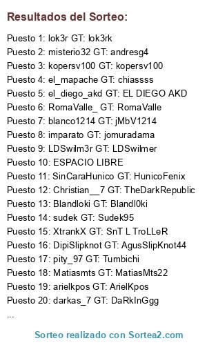 Lista de participantes: kopersv100 GT: kopersv100, nahuelriver94 GT: nahuelriver14, DipiSlipknot GT: AgusSlipKnot44, messi321 GT: CravenTrash3896, RomaValle_ GT: RomaValle, s3firot GT: Urubrian360, Blandloki GT: Blandl0ki, imparato GT: jomuradama, EliasGamers GT: theJulianXBOX, el_mapache GT: chiassss, LDSwilm3r GT: LDSwilmer, piratasodero GT: lunatucumana, EDSON1313 GT: EDSON 1313, Christian__7 GT: TheDarkRepublic, PsrfYankee GT: SantiagoPSRF, blanco1214 GT: jMbV1214, SinCaraHunico GT: HunicoFenix, Matiasmts GT: MatiasMts22, lok3r GT: lok3rk, darkas_7 GT: DaRkInGgg, arielkpos GT: ArielKpos, el_diego_akd GT: EL DIEGO AKD, XtrankX GT: SnT L TroLLeR, misterio32 GT: andresg4, sudek GT: Sudek95, Temy GT: PuntoGG, Skyman666 GT: MMarshall7, pity_97 GT: Tumbichi, jotero15 GT: Juako1596, dieycin GT: MicrobialGore14, claudiomuino GT: xoxclaudioxox, ESPACIO LIBRE.