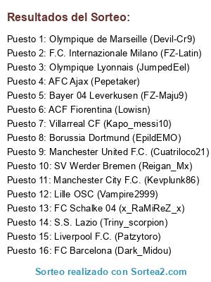 Lista de participantes: Manchester City F.C. (Kevplunk86), Manchester United F.C. (Cuatriloco21), Liverpool F.C. (Patzytoro), FC Barcelona (Dark_Midou), Bayer 04 Leverkusen (FZ-Maju9), F.C. Internazionale Milano (FZ-Latin), Olympique Lyonnais (JumpedEel), Borussia Dortmund (EpildEMO), FC Schalke 04 (x_RaMiReZ_x), S.S. Lazio (Triny_scorpion), Lille OSC (Vampire2999), SV Werder Bremen (Reigan_Mx), Olympique de Marseille (Devil-Cr9), AFC Ajax (Pepetaker), ACF Fiorentina (Lowisn), Villarreal CF (Kapo_messi10).