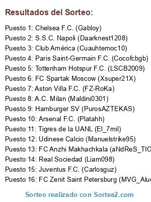 Lista de participantes: Arsenal F.C. (Platahh), Chelsea F.C. (Gabloy), A.C. Milan (Maldini0301), Juventus F.C. (Carlosguz), S.S.C. Napoli (Daarknest1208), Paris Saint-Germain F.C. (Cocofcbgb), Tottenham Hotspur F.C. (LSCB2009), FC Anzhi Makhachkala (aNdReS_TICO), Aston Villa F.C. (FZ-RoKa), FC Spartak Moscow (Xsuper21X), Club América (Cuauhtemoc10), Real Sociedad (Liam098), Udinese Calcio (Manuelstrike95), FC Zenit Saint Petersburg (MVG_Alucard), Hamburger SV (PurosAZTEKAS), Tigres de la UANL (El_7mil).