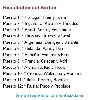 Lista de participantes: * España: Esmirna y Fear, * Inglaterra: Kolorin y Theddus, * Alemania: Kid y Hector, * Italia: Pedro y Bomber, * Francia: Cristian y Adri, * Holanda: Varo y Dpa, * Brasil: Adris y Festimario, * Argentina: Danigea y Jmantin, * Portugal: Fran y Tchité, * Croacia: Wolverine y Romano, * Rusia: Paco y Problade, * Uruguay: Juampi y Letal.