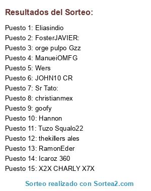 Lista de participantes: X2X CHARLY X7X, ManueiOMFG, Wers, JOHN10 CR, Eliasindio, Icaroz 360, FosterJAVIER:, Sr Tato:, Tuzo Squalo22, orge pulpo Gzz, christianmex, Hannon, goofy, RamonEder, thekillers ales.