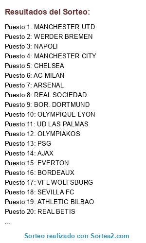 Lista de participantes: AC MILAN, ATHLETIC BILBAO, LIVERPOOL, MANCHESTER CITY, MANCHESTER UTD, NAPOLI, OLYMPIAKOS, REAL BETIS, REAL MADRID CF, REAL SOCIEDAD, SL BENFICA, VFL WOLFSBURG, AJAX, ARSENAL, ATLETICO MADRID, BOR. DORTMUND, BORDEAUX, BORUSSIA MG, CHELSEA, EVERTON, OLYMPIQUE LYON, PSG, SAMPDORIA, SEVILLA FC, UD LAS PALMAS, WERDER BREMEN.