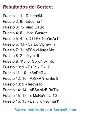 Lista de participantes: 1.- Rubern94, 2.- Jxyro19, 3.- oFSo xIJorgeAIx, 4.- x DTLRx NeYmAr11, 5.- ferove1o, 6.- Jose Gamez, 7.- King GaBo, 8.- Edder cr7, 9.- EsFc x Tiki 7, 10.- kAxPeRtJ, 11.- oFSo xINokmIx, 12.- x MaRaViLla 10, 13.- CarLo VigneRi 7, 14.- oFSo xIcFiRoTIx, 15.- EsFc x Neymar11, 16.- AxSxP Yrsinho 9.